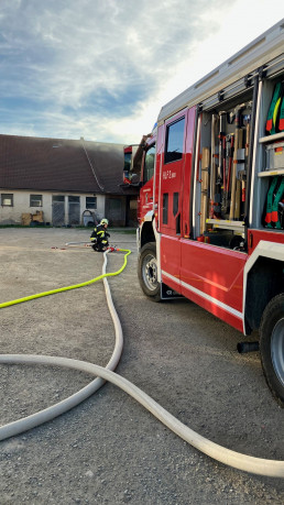 Die FF Stanz schützte mit dem HLF 2 das Nebengebäude und der Atemschutztrupp musste im Brandobjekt Gasflaschen ins freie bringen!