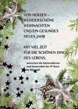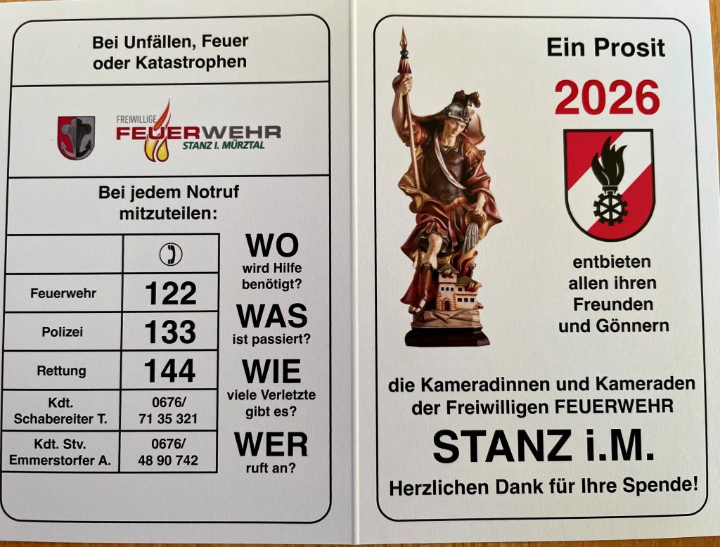 Die Kameradinnen und Kameraden der FF Stanz im Mürztal wüschen allen Bewohnerinnen und Bewohner der Gemeinde Stanz ein gutes, Unfallfreies neues Jahr 2026 und bedanken sich für die Spenden bei der Silvestersammlung die wieder für die Anschaffung von benötigten Geräten und Einsatzbekleidung verwendet werden!